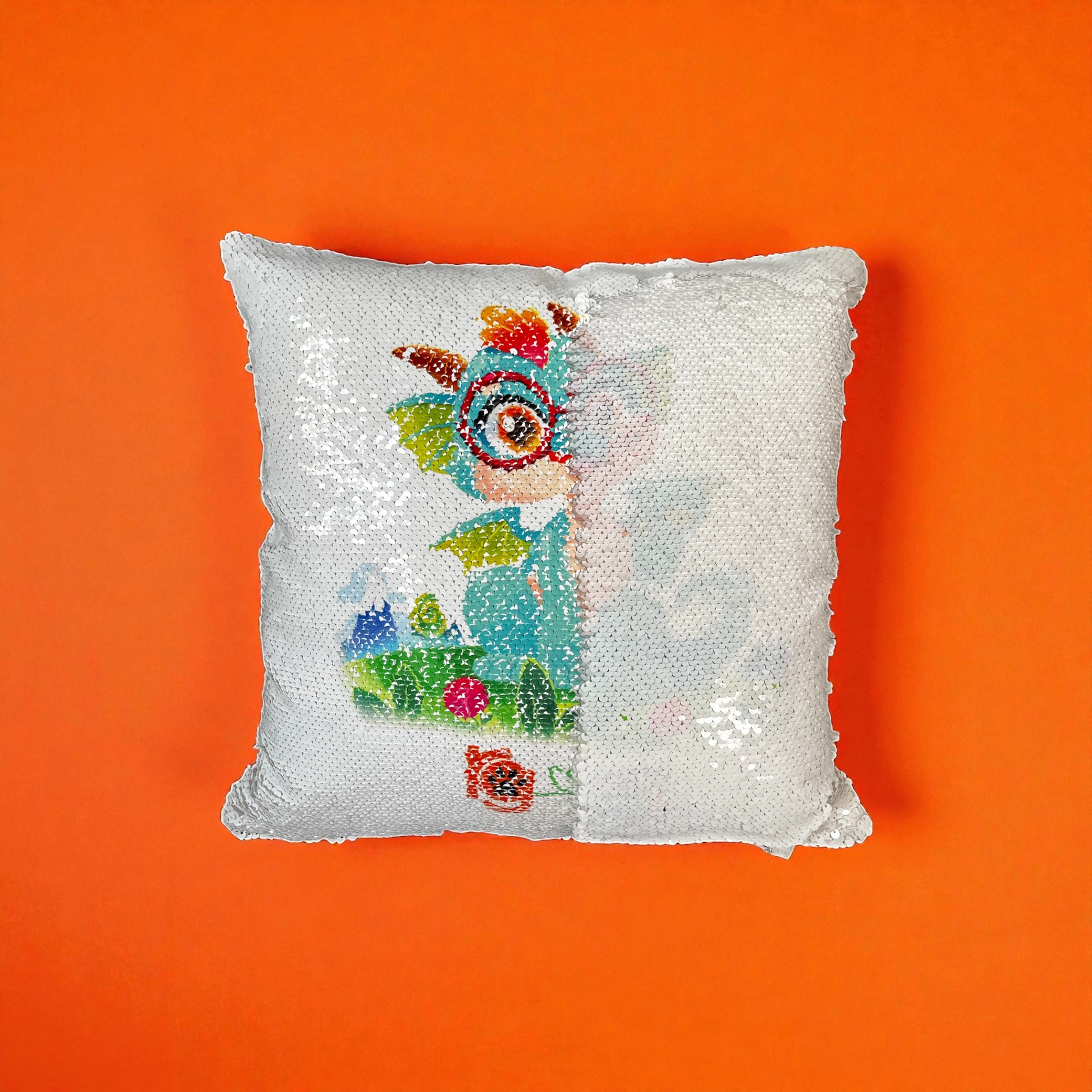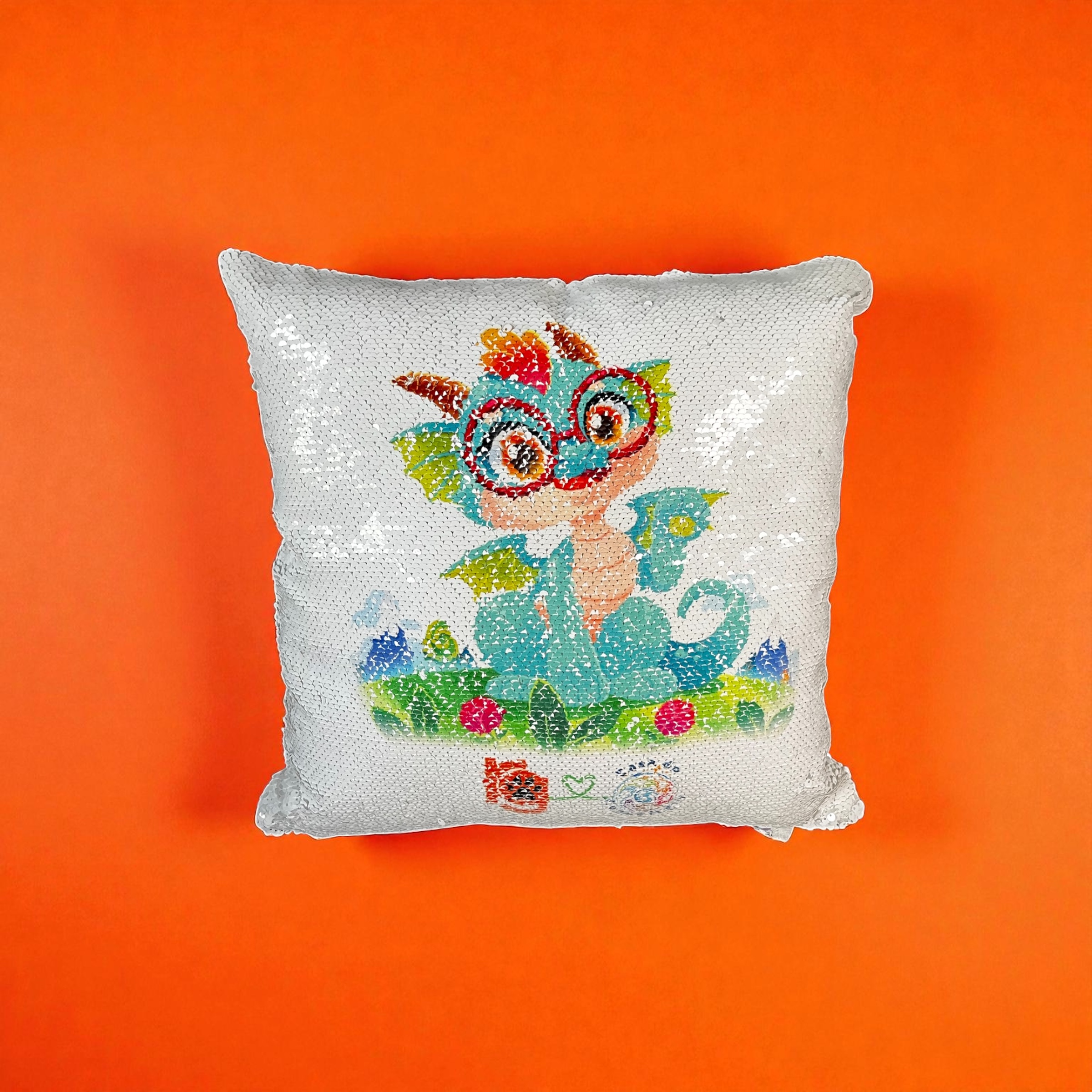 Uma maravilhosa almofada com lantejoulas dupla face, com ilustração do Dragãozinho.