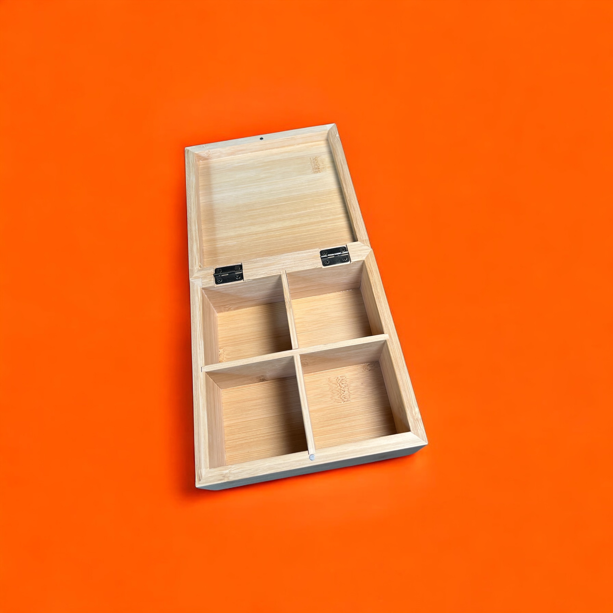 Caixa de chá em bambu com 4 compartimentos e fecho com imã.