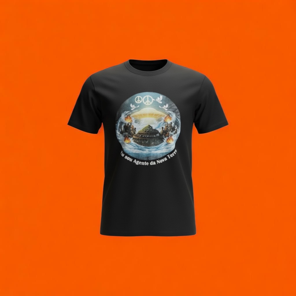 Camiseta preta, manga curta com ilustração dos elementos fogo, terra, água e ar e o dizer Eu Sou Agente da Nova Terra.