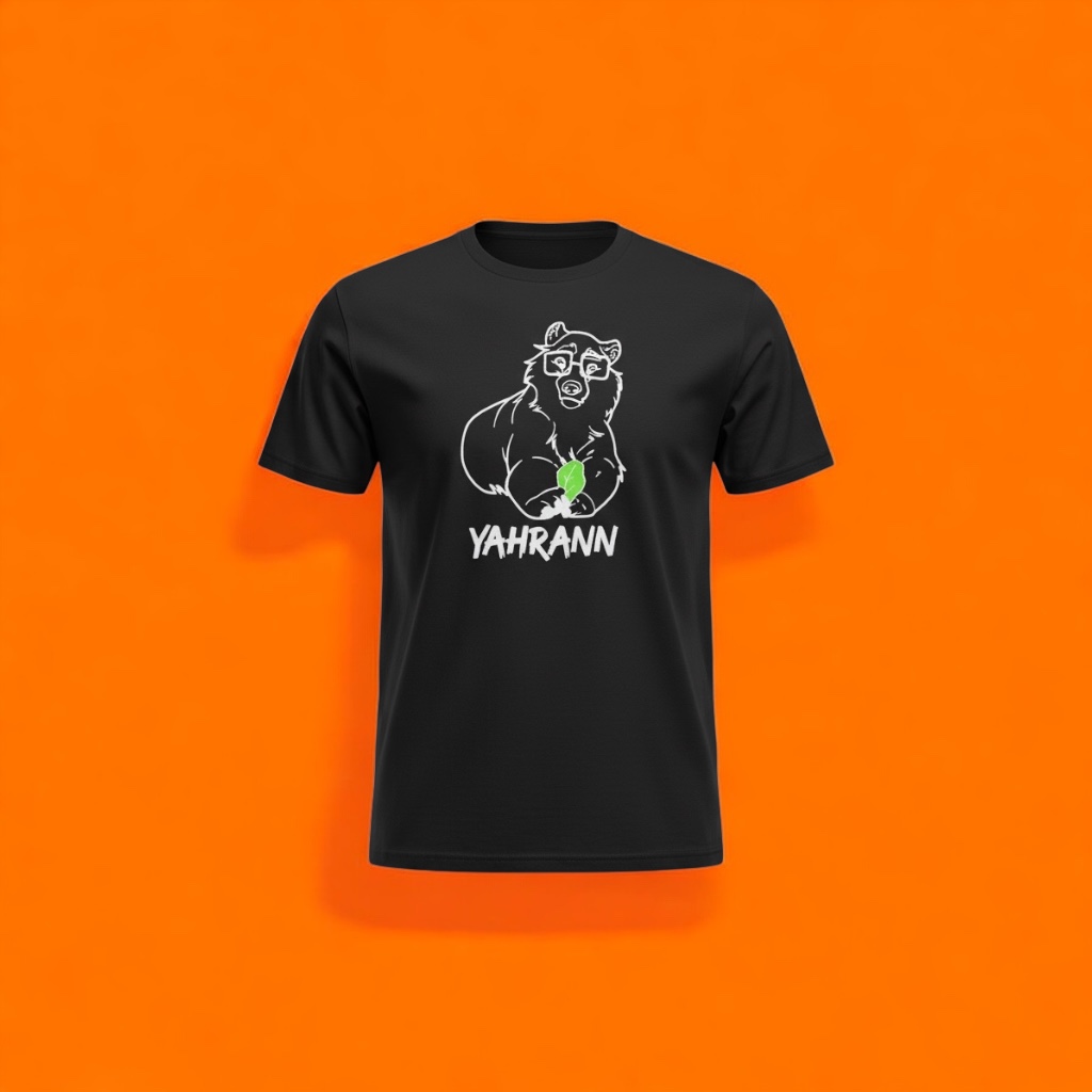 Linda camiseta preta, manga curta com ilustração do amado Ursinho Yahrann em branco (detalhe da couve em verde).