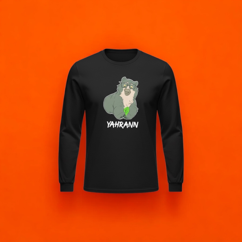 Linda camiseta preta, manga longa, com ilustração do amado urso-de-óculos Yahrann, em contorno branco, segurando uma folha de couve, na cor verde.