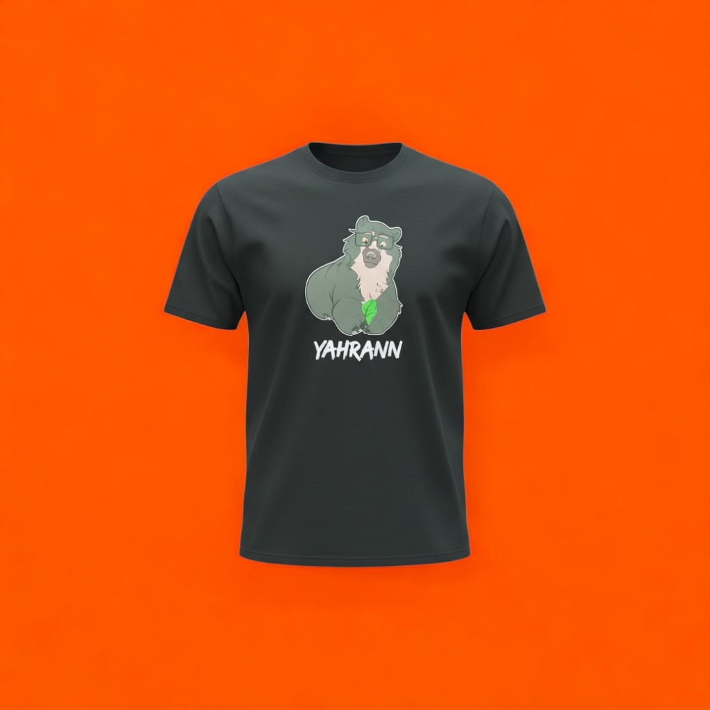 Linda camiseta preta, manga curta, com ilustração colorida do amado urso-de-óculos Yahrann, segurando uma folha de couve, na cor verde.