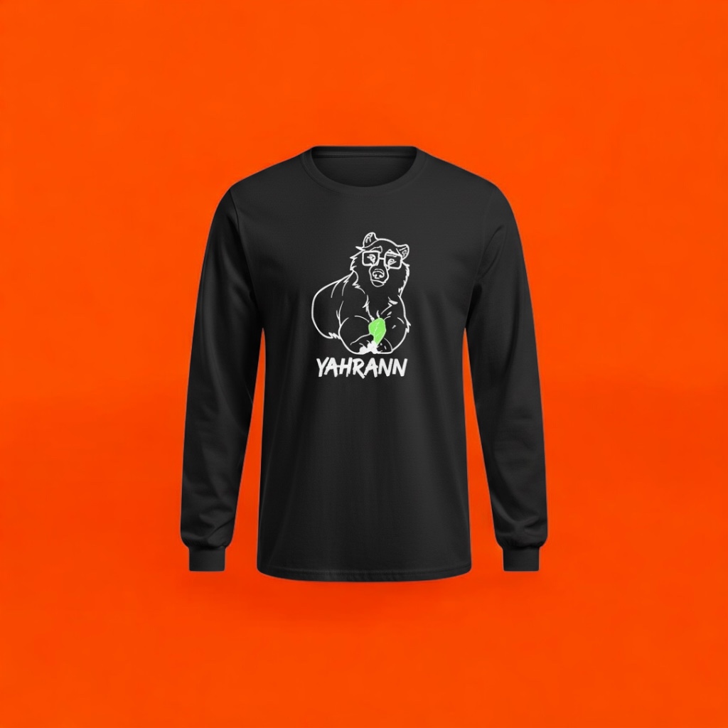 Linda camiseta preta, manga longa, com ilustração do amado urso-de-óculos Yahrann, em contorno branco, segurando uma folha de couve, na cor verde.