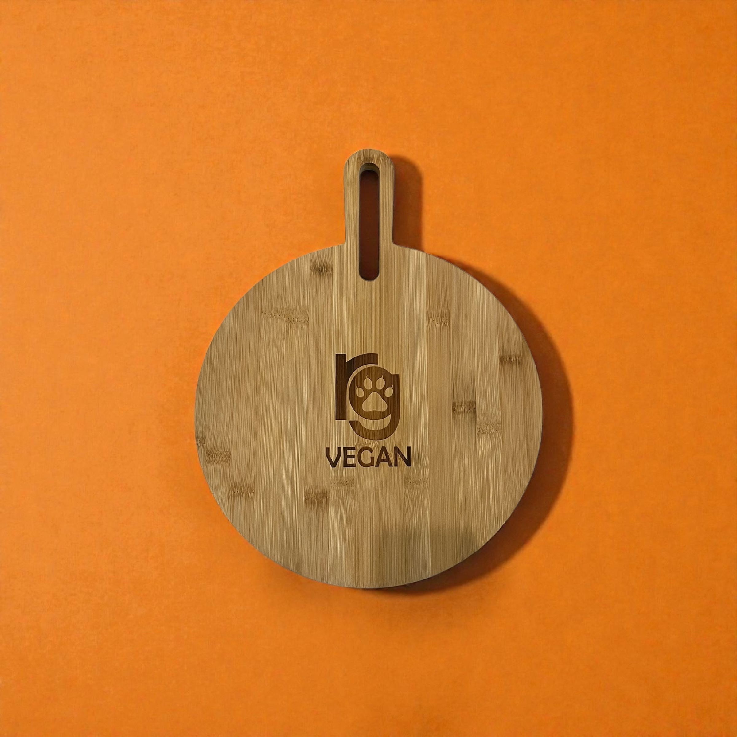 Tábua de corte em madeira com a marca Rancho dos Gnomos e o escrito Vegan.
